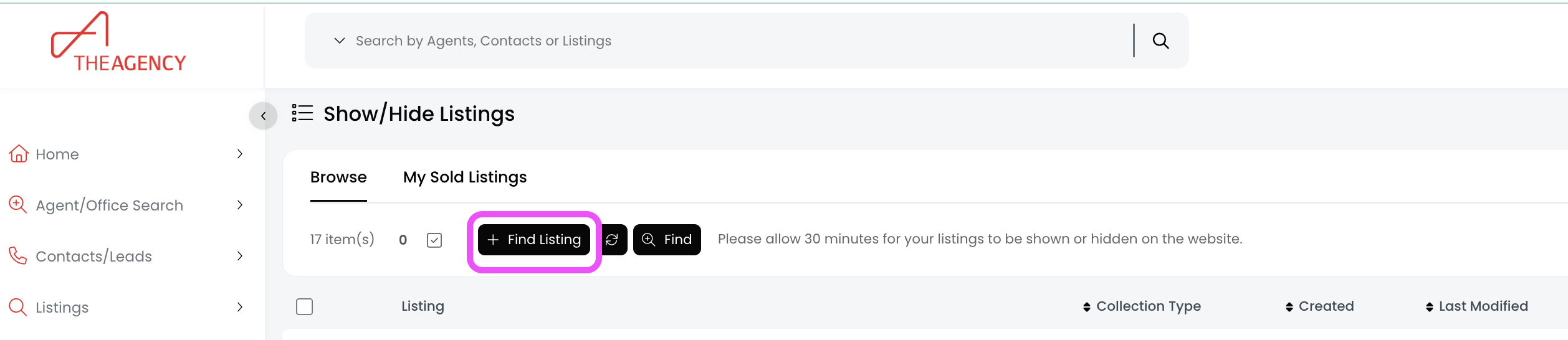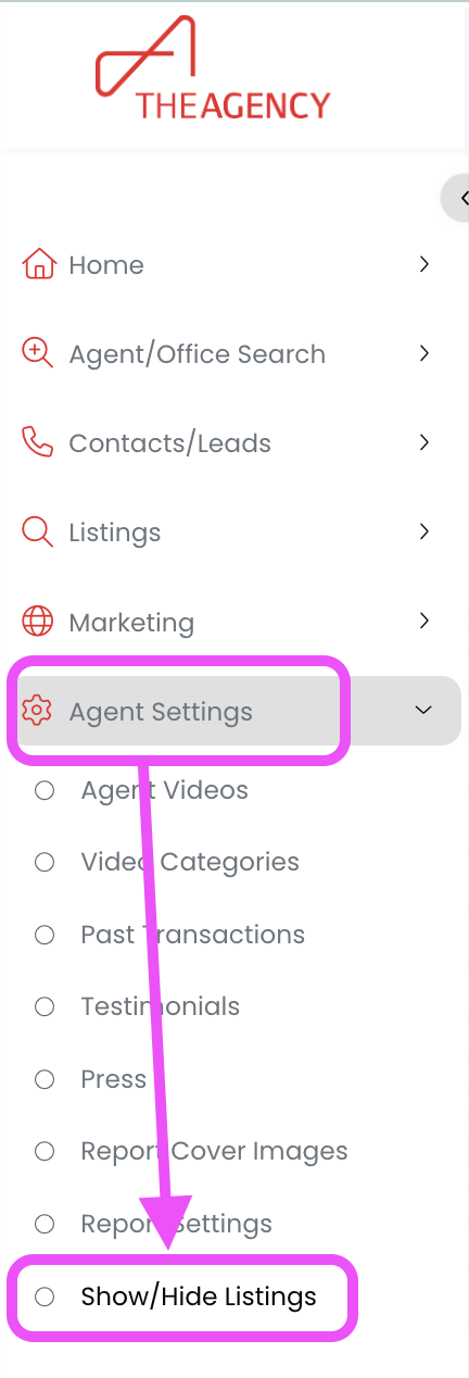 1.) Click on the Agent Settings tab, then click on Show/Hide Listings