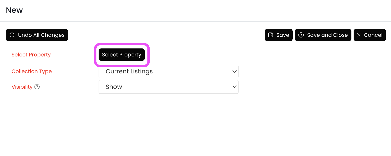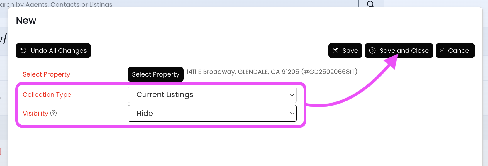 10.) Set the "Collection Type" field to Current Listings. Set the "Visibility" field to Hide. Then click on the Save and Close button