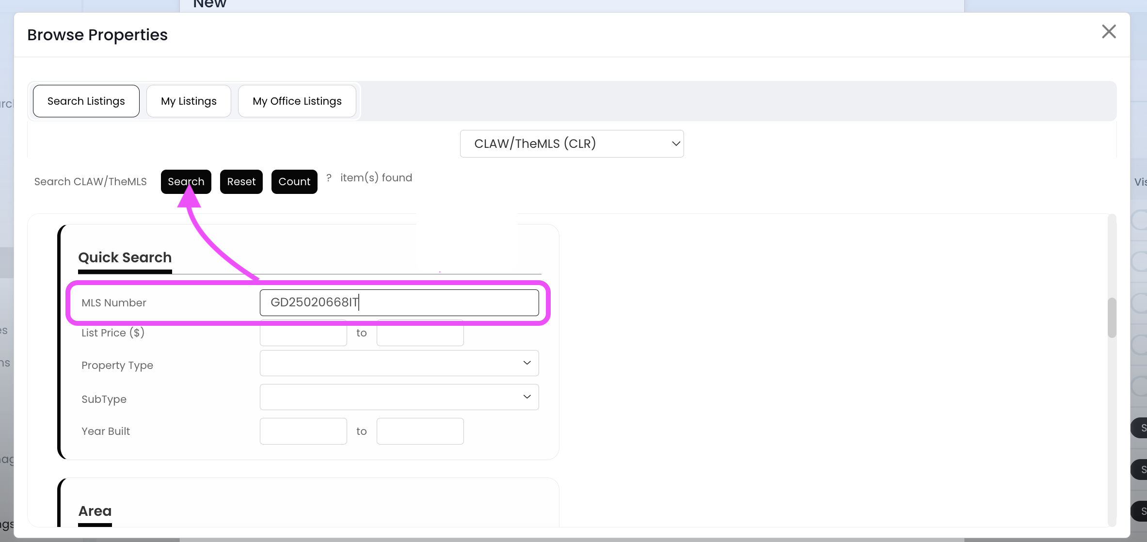 8.) Go back to APT, and paste that number into the MLS Number field (located in the Quick Search section). Then click the Search button (at the top)