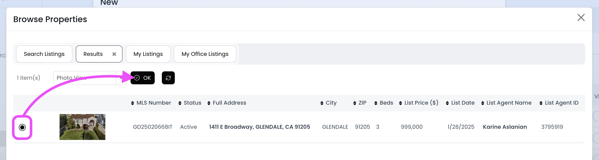 9.) Select the proper listing by clicking inside the circle towards the left, and then click on the OK button