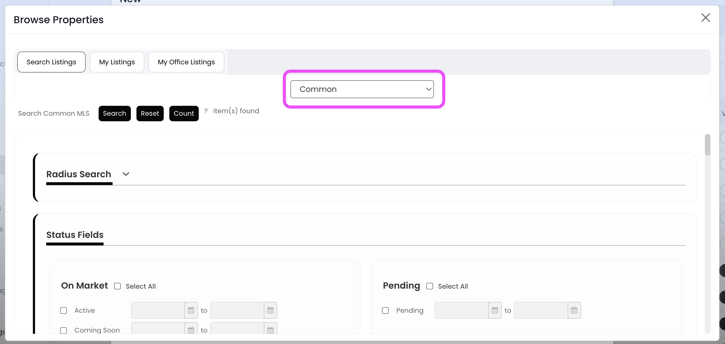 4.) Click on Common to expand additional MLS boards, and then select the MLS name that this listing is feeding from
