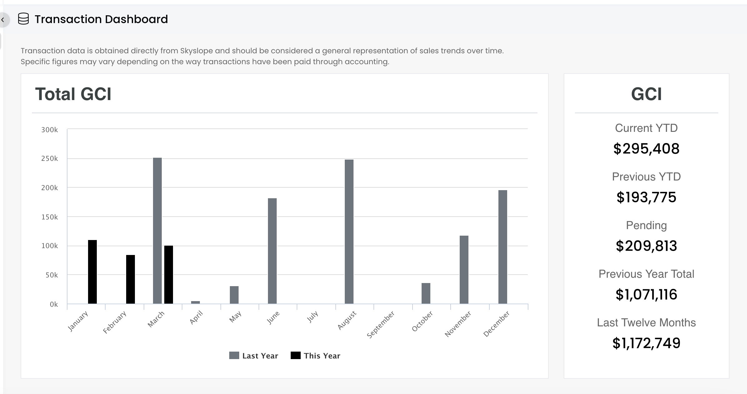 The Transaction Dashboard in APT shows your closed production metrics. You'll see totals for your GCI, Volume, and Counts. You can also see metrics for Pending, Last Year, and Last 12 Months