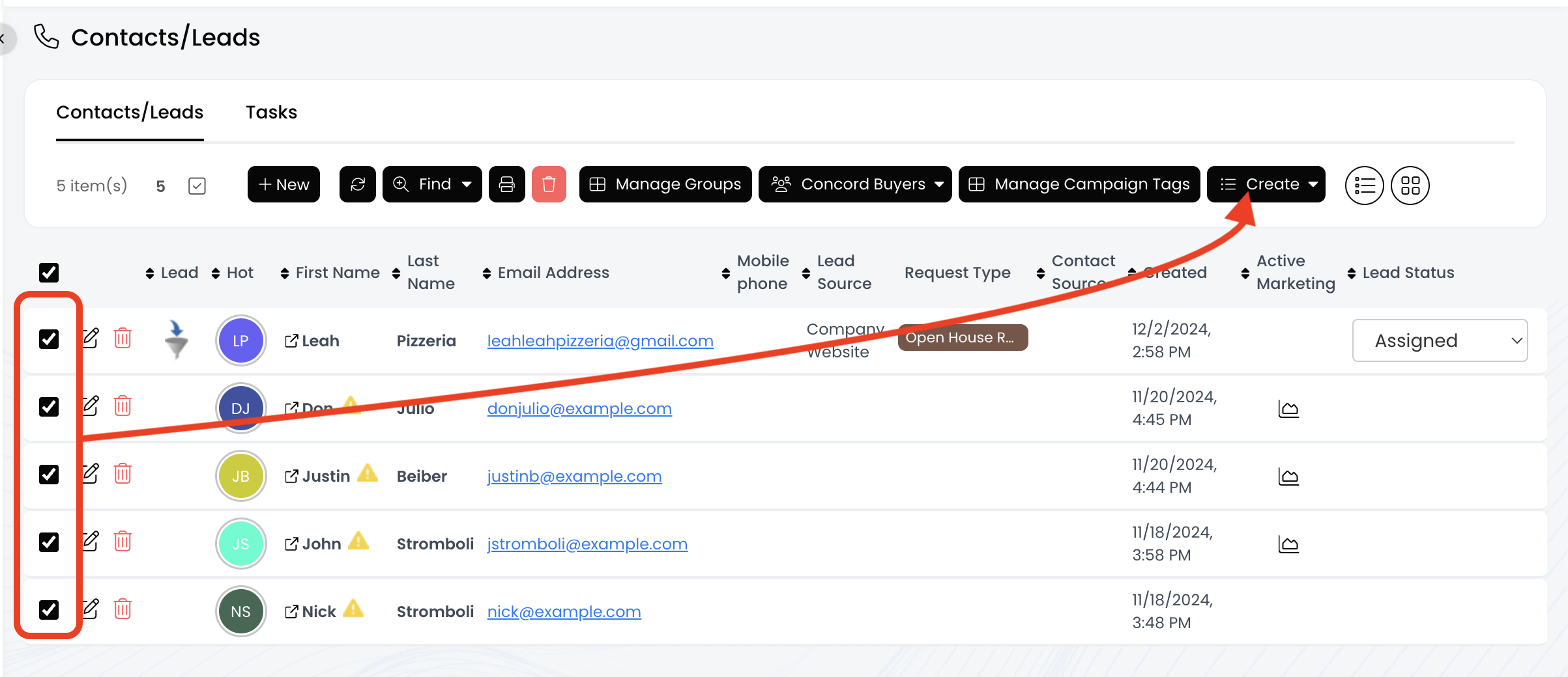 5.) Select the contacts by clicking the checkboxes to the left. Then, click on the Create button