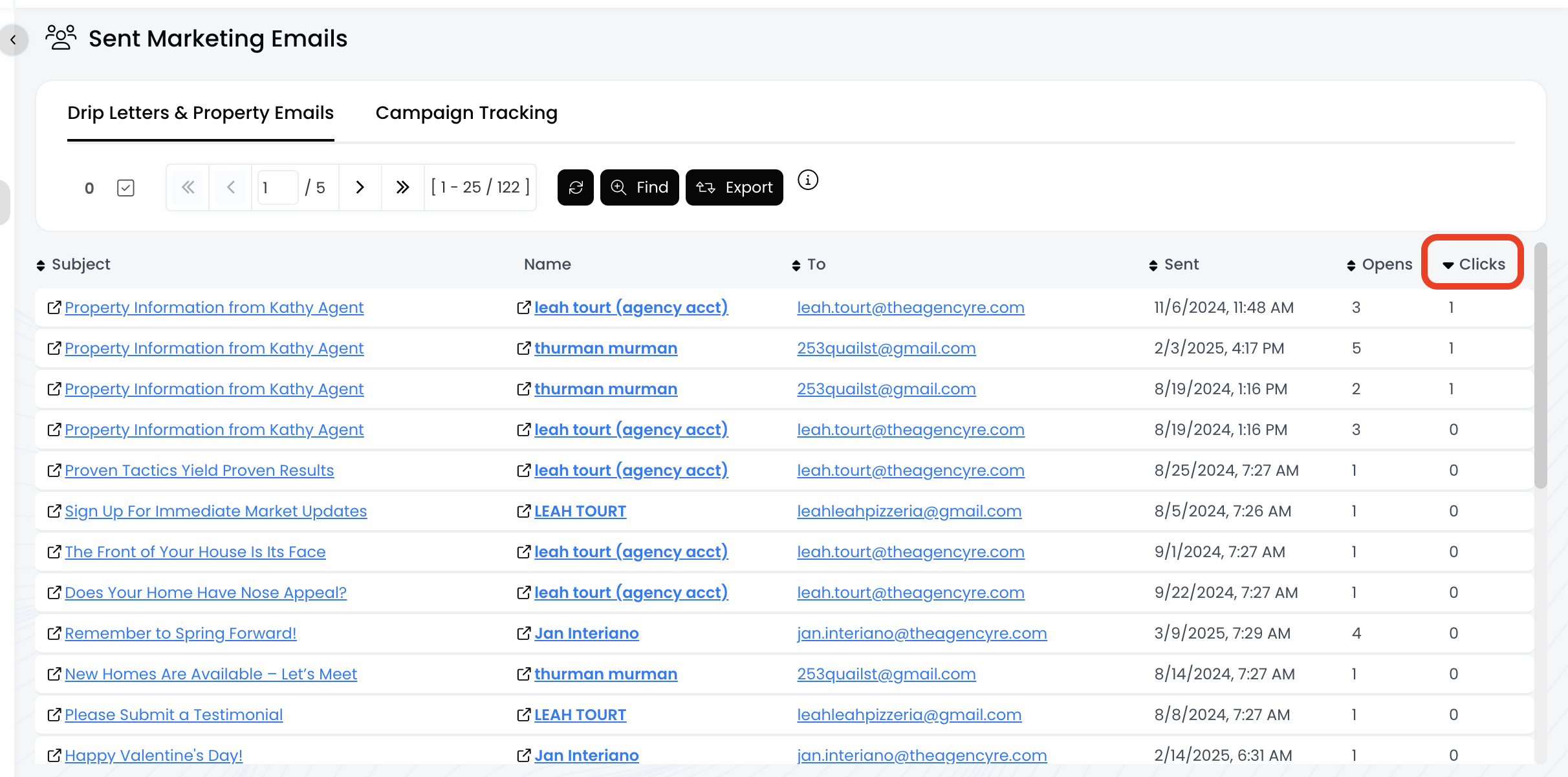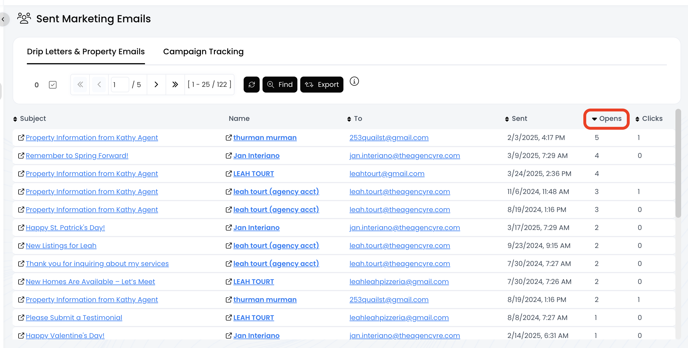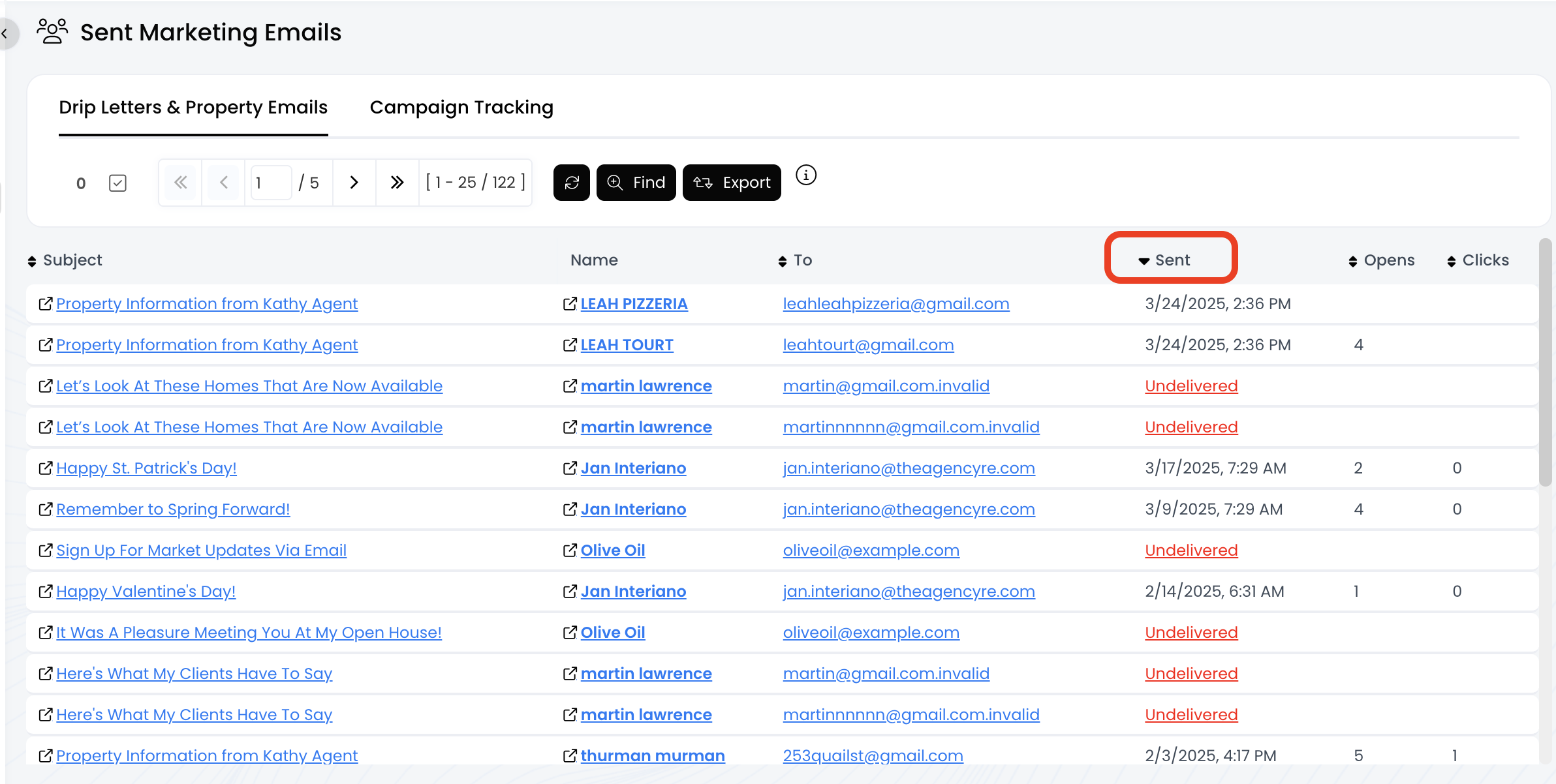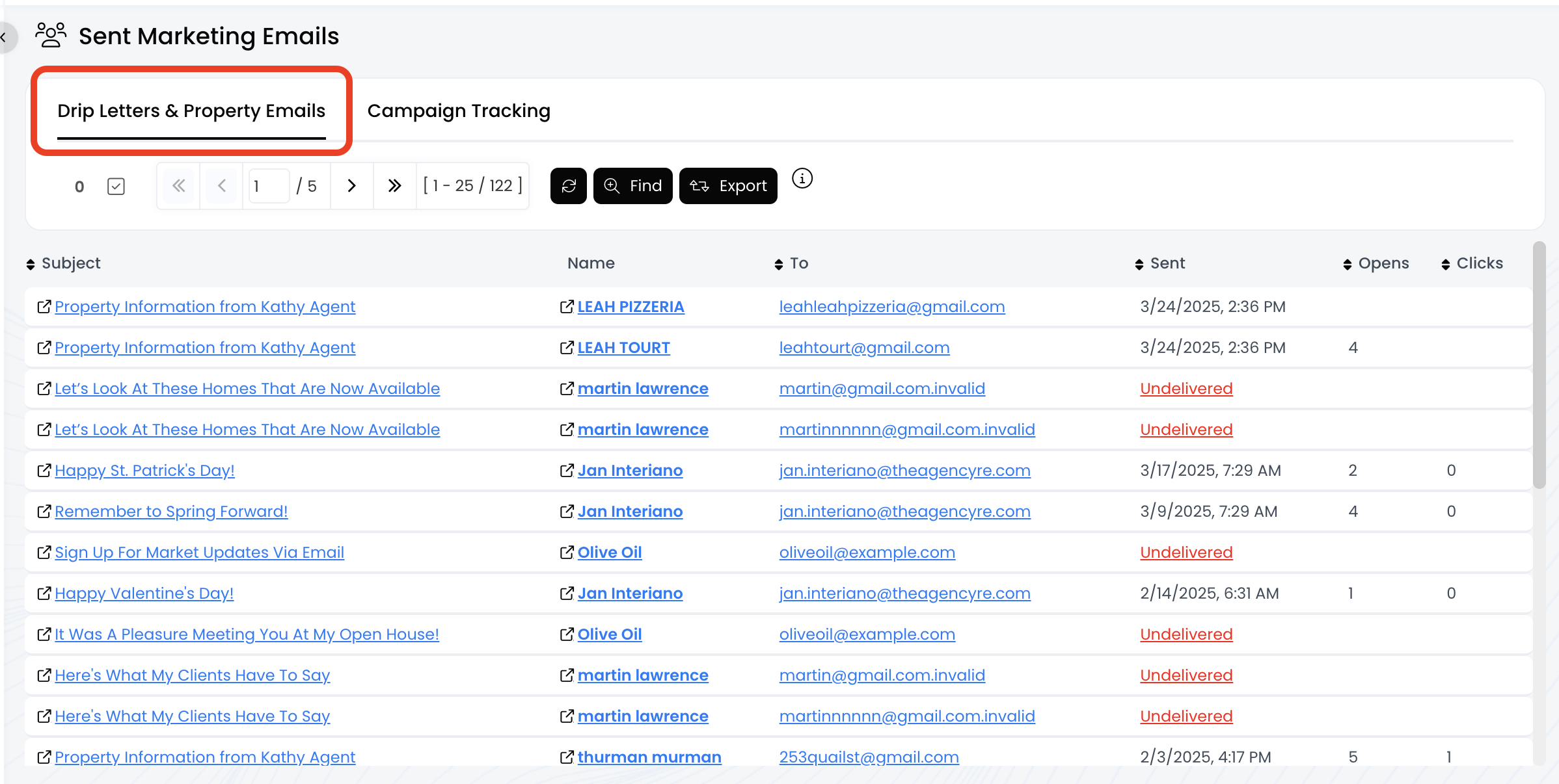 - Drip Letters & Property Emails: Displays metrics for the email sent to each contact