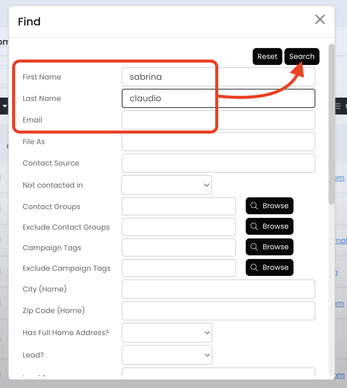 4.) Search for the contact using the first name, last name, or email fields and then hit Search