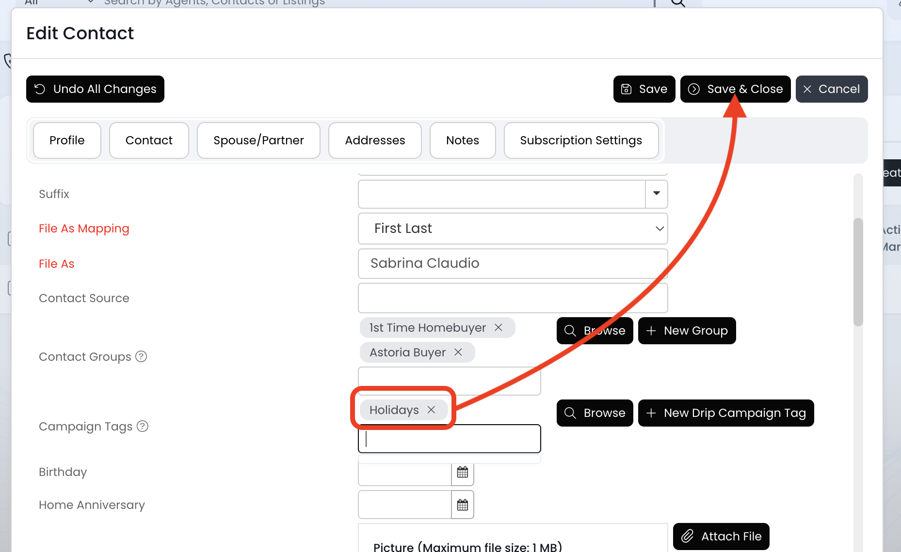 7.) You should now see the campaign tag has been added above. Once you confirm that, click on the Save & close button