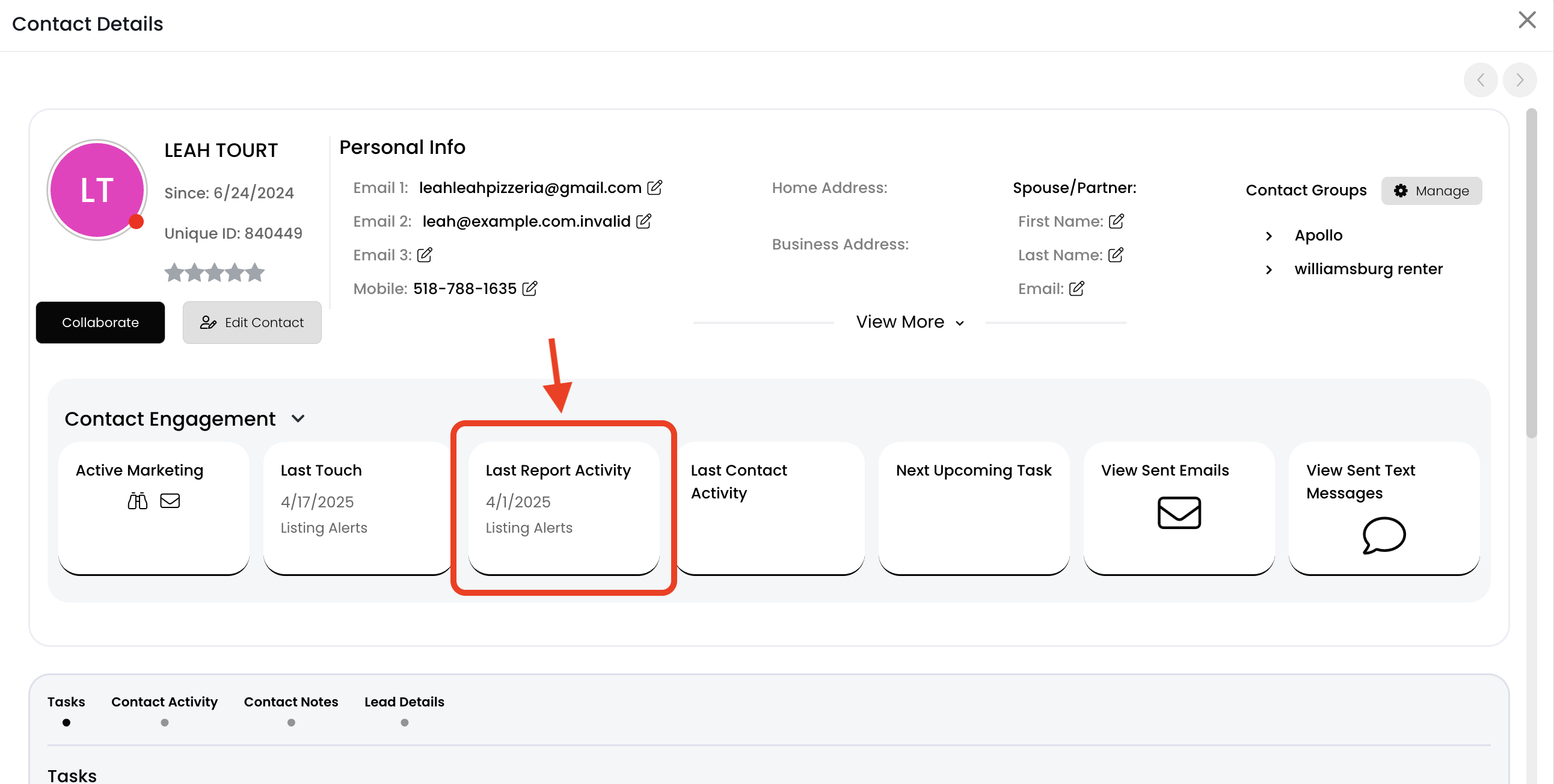 If you've created any reports for a contact, all of the metrics are compiled in APT for each report! This information can be found under the contact in the "Last Report Activity" section. If you don’t see any details in this section, this person has not opened any reports you’ve created for them.