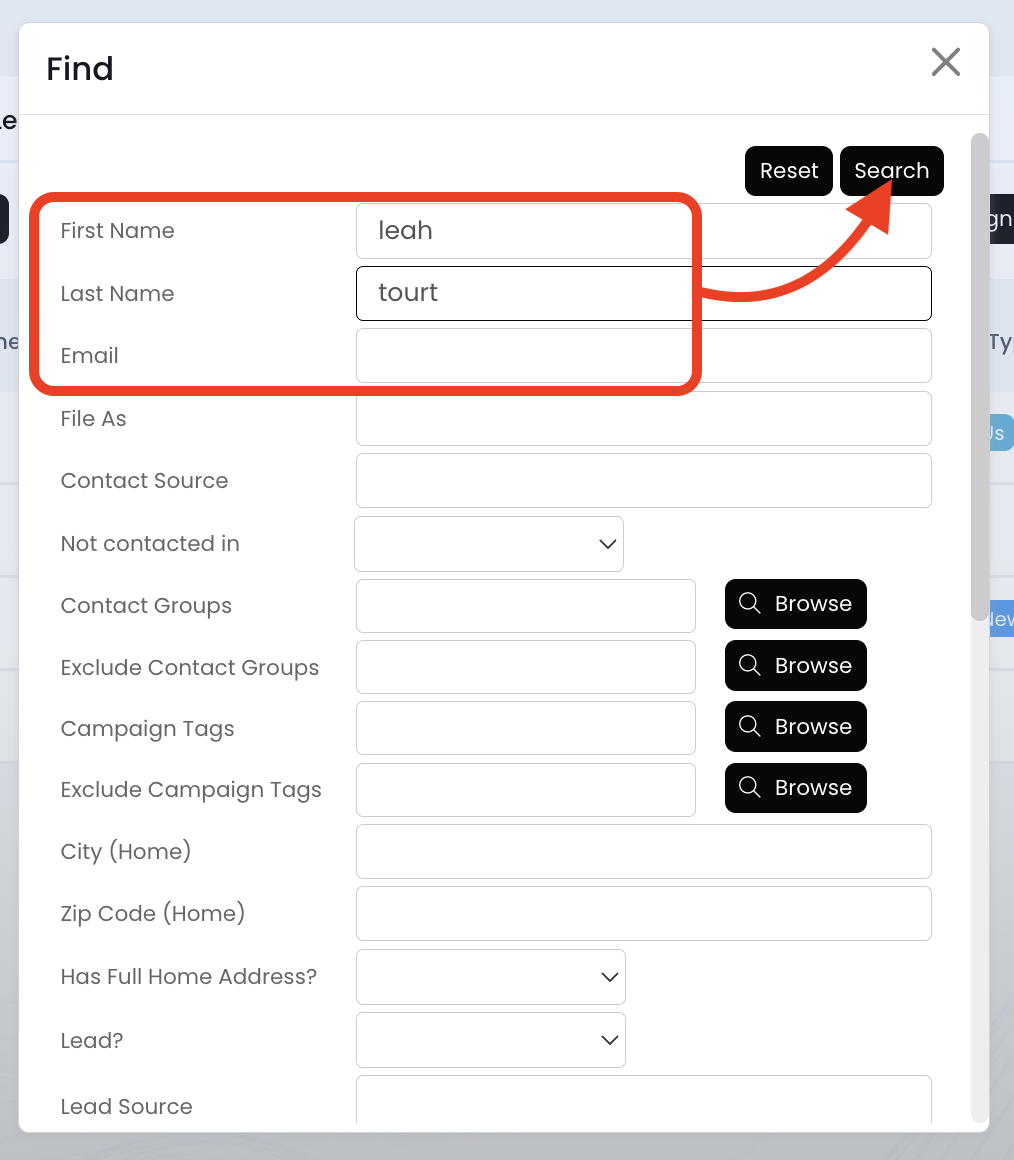 4.) Search for the contact using the first name, last name, or email fields and then hit Search