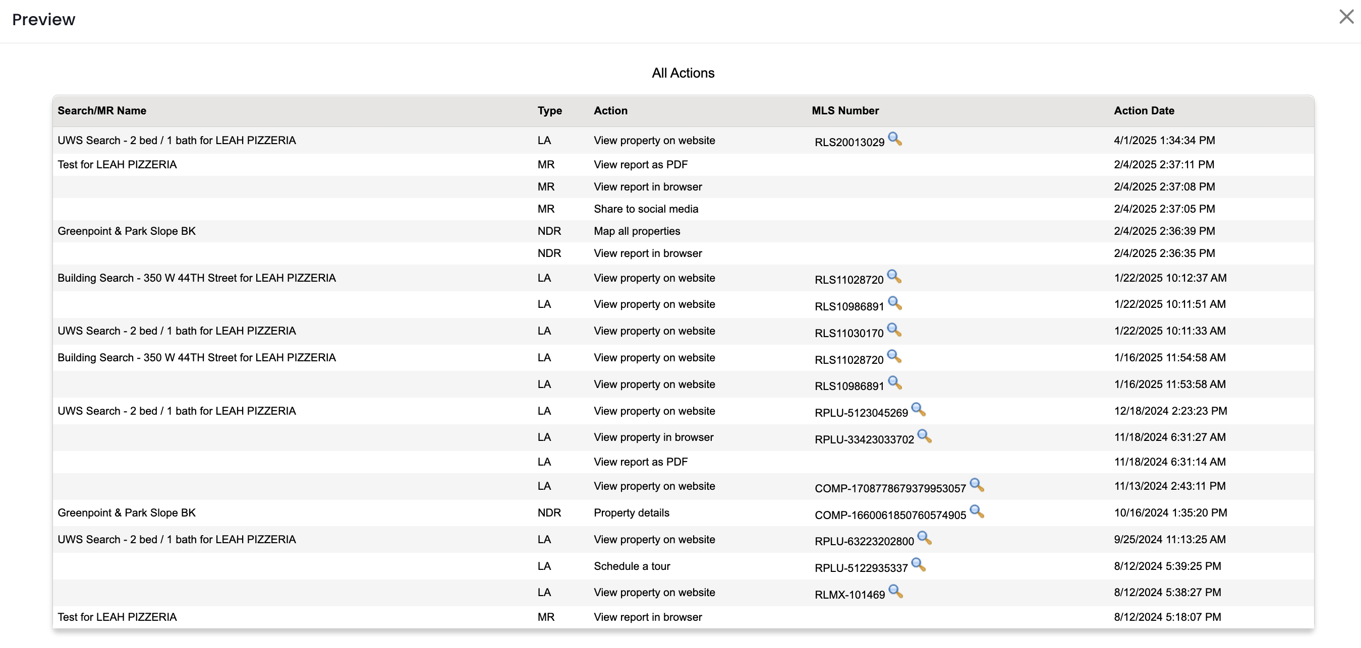 7.) Now you'll see all the reports this person has viewed/opened. You can click on the magnifying glass icon to view more information about the property.
