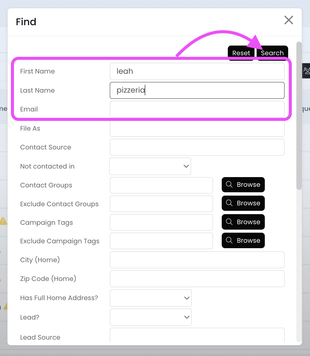 3.) Search for the contact using the first name, last name, or email fields and then hit Search